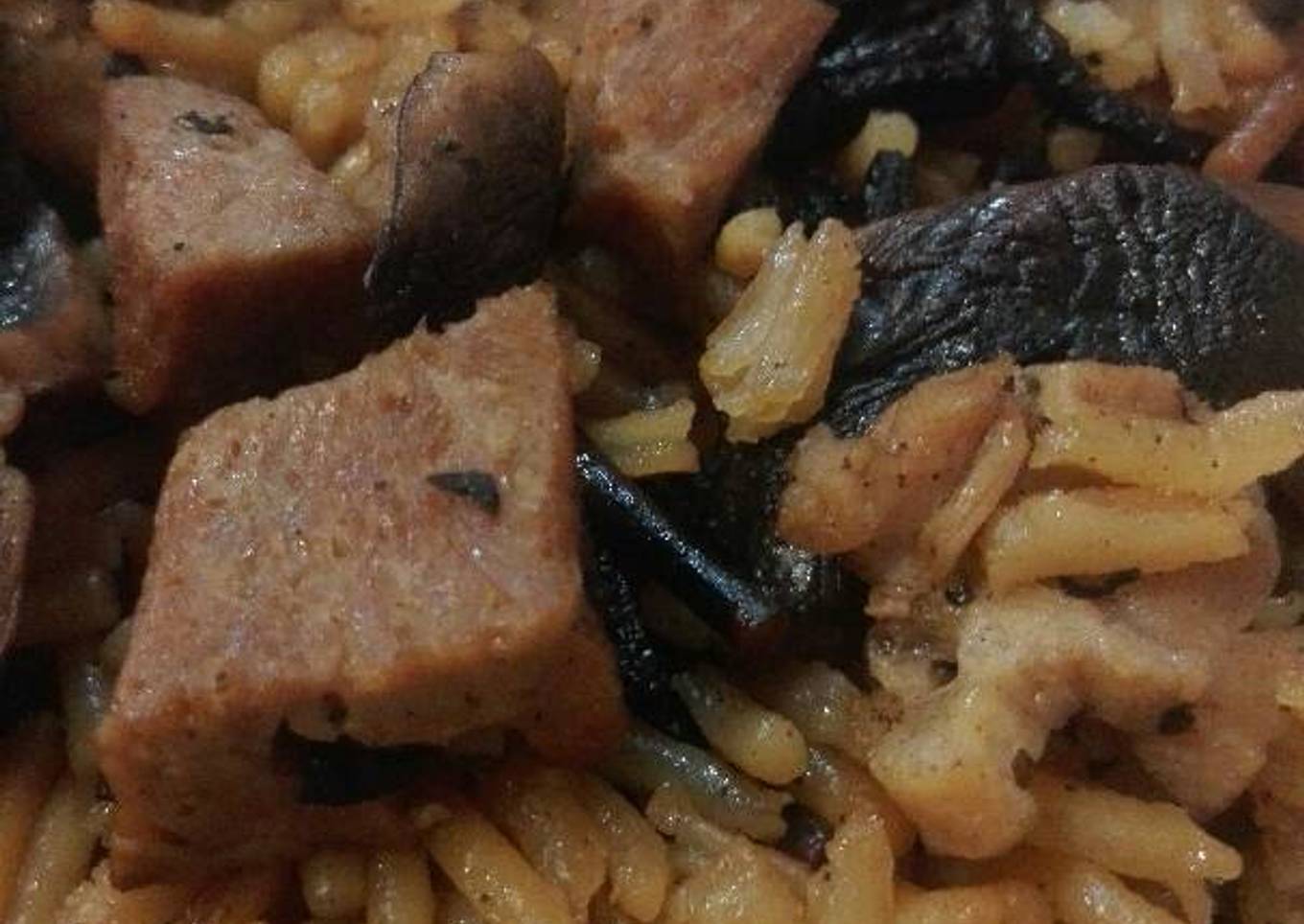 - Tapa y deja que la cebolla se queme por completo, agrega el ajo en rodajas finas, el arroz y los fideos, deja que doren y agrega 4 tazas de agua tibia, los champiñones y sazona.