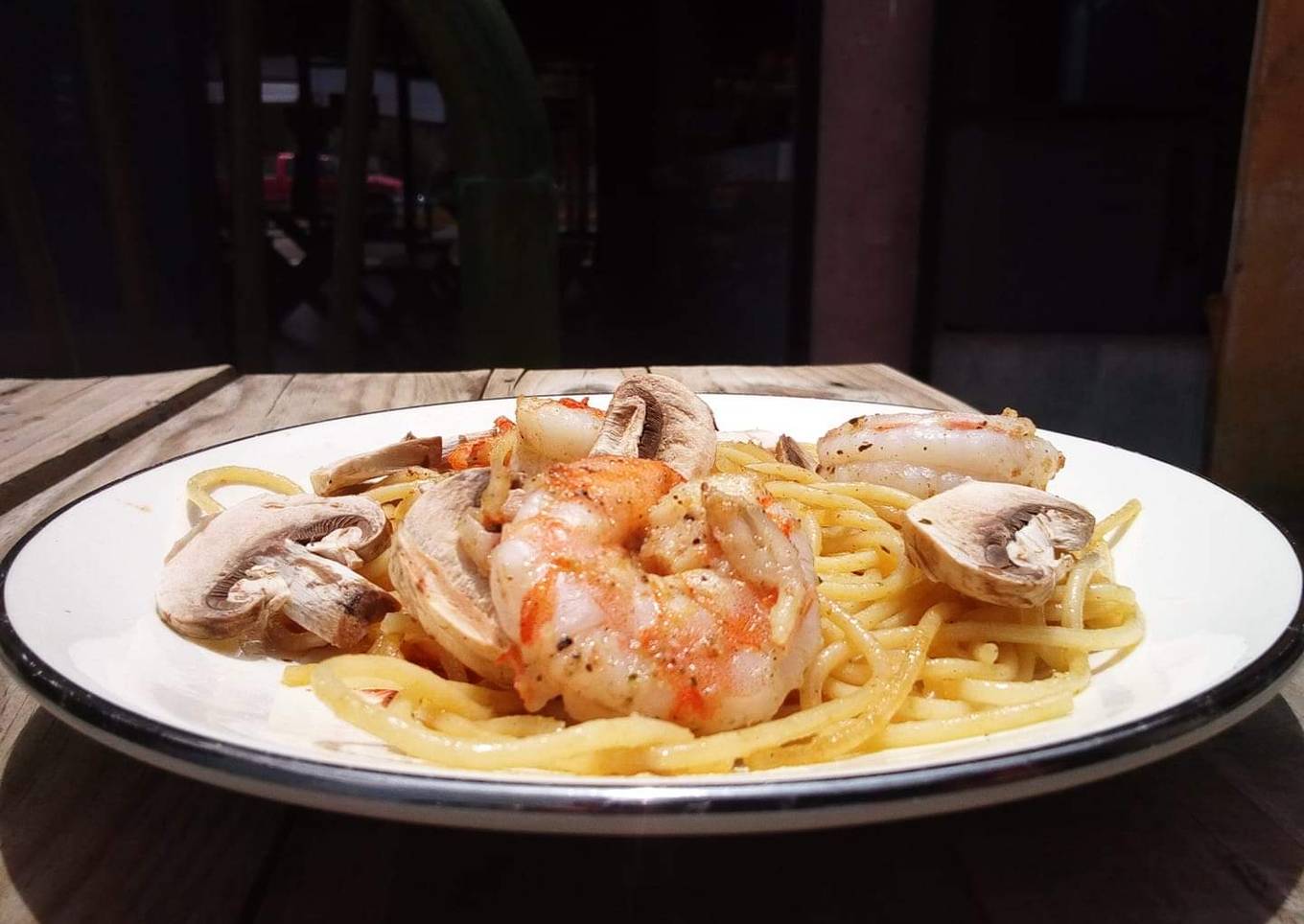 - En una sartén derrite la margarina y agrega los camarones, saltéalos y agregarles finas hierbas (1/2 cucharada sopera) una vez cocidos agrega los champiñones y saltéalos, agregas salsa Maggi, 5 agitadas aproximadamente.