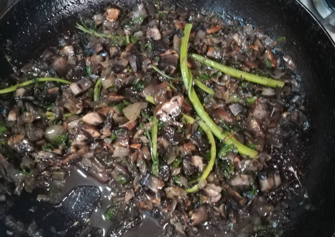 - En una sartén pon el aceite a calentar, agrega la cebolla, cuando reviente los ajos deja que doren un momento y agrega las setas y el epazote finamente picado. Los tallos del epazote también agrégalos después te será más fácil retirar. Deja guisar por unos 5-6 minutos.