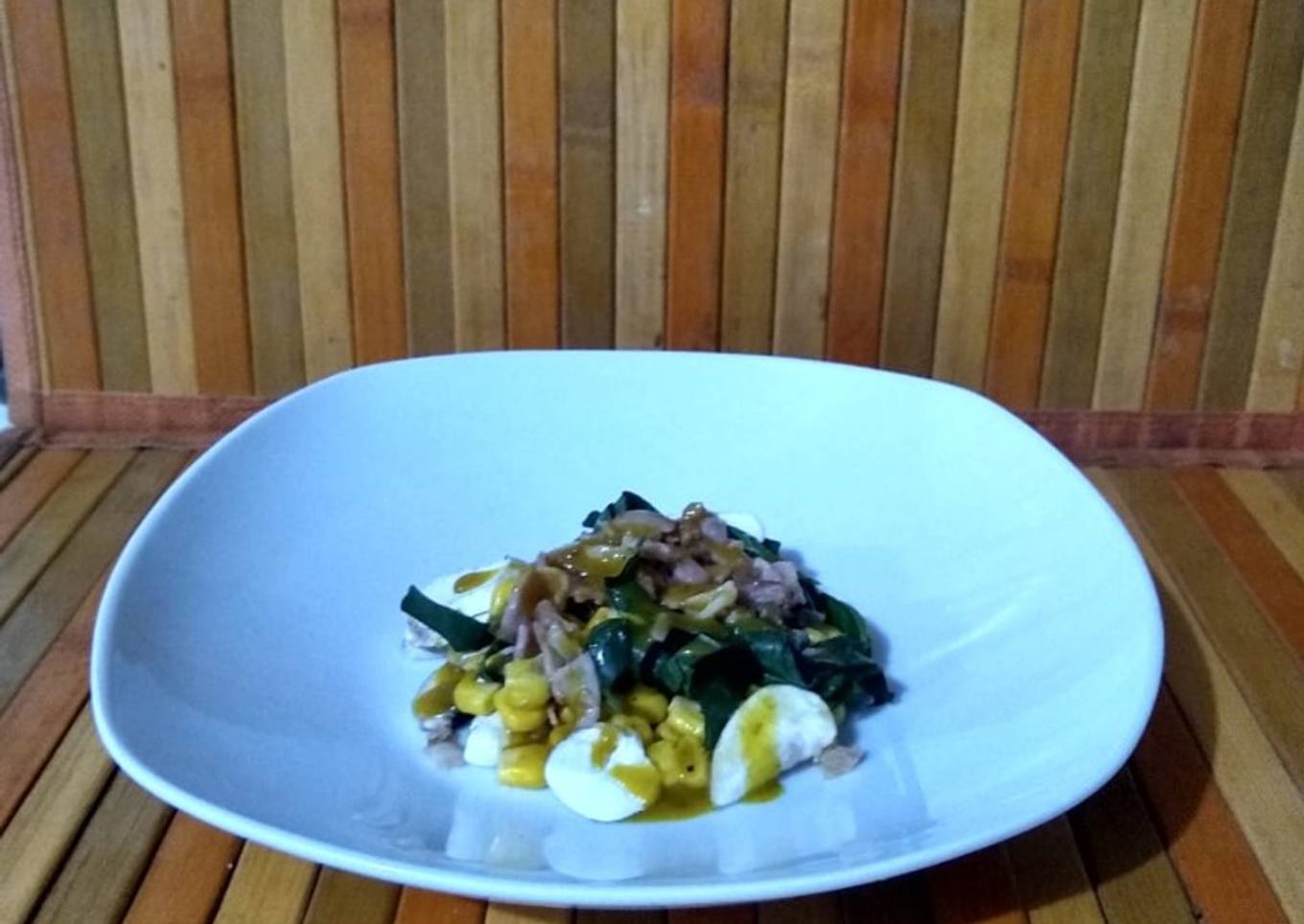 - Colocar las espinacas en el plato, agregar los granos de elote y mezclar, espolvorear con tocino crujiente