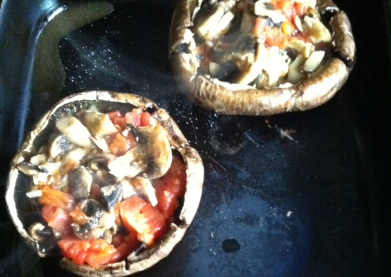 - Picamos un diente de ajo y lo ponemos a saltear en un poco de aceite, añadimos 2 champiñones picados por cada portobello y un jitomate pelado y picado, sazonamos con sal y pimienta y una vez que estén listos rellenamos nuestros portobello y los metemos al horno.