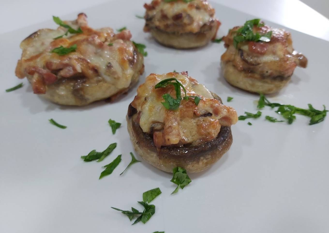 - En el recipiente para horno con papel vegetal vamos poniendo las canastillas de champiñones y vamos rellenando con la mezcla anterior y le ponemos por encima un poconde mozzarella y al.horno 5 o 10 minutos aproximadamente hasta que se derrite la mozzarella y listo!!