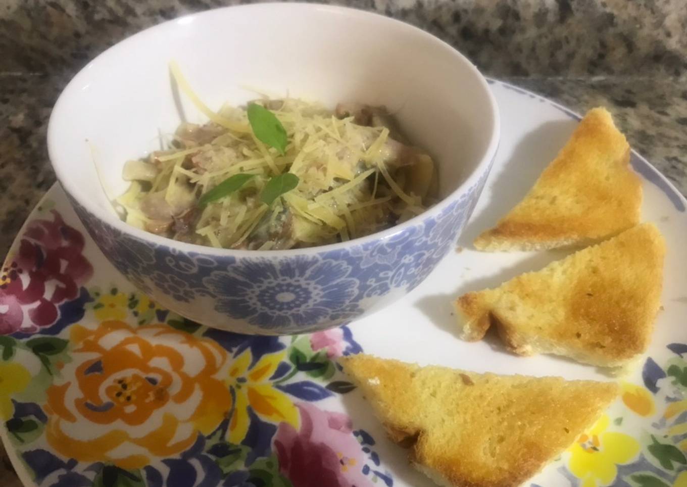 Pasta con salsa de tres quesos, champiñones y tocineta