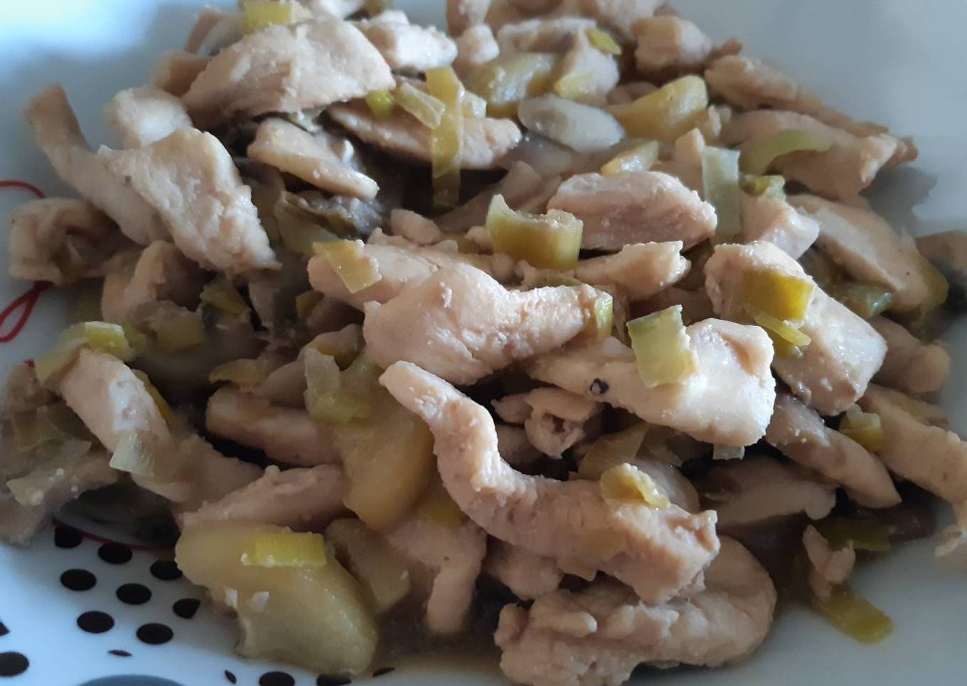 Instructions to make to make Pollo salteado con champiñones, calabacín y puerro