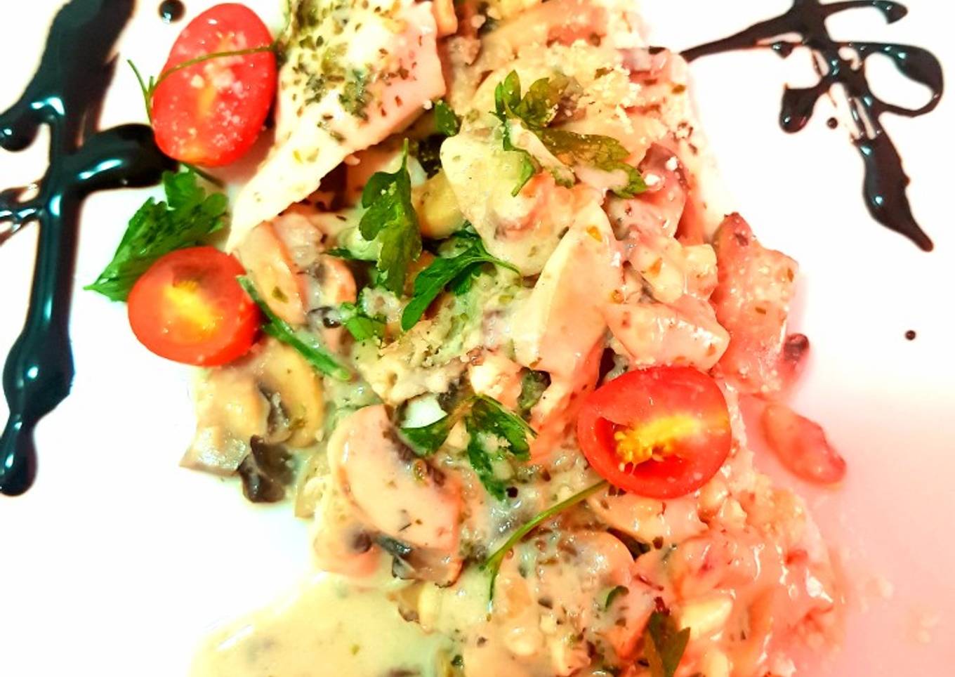- Poner el solomillo de pavo en el plato y añadir encima la crema de champiñones. Terminare con una spolverada de perejil fresco y parmesano.