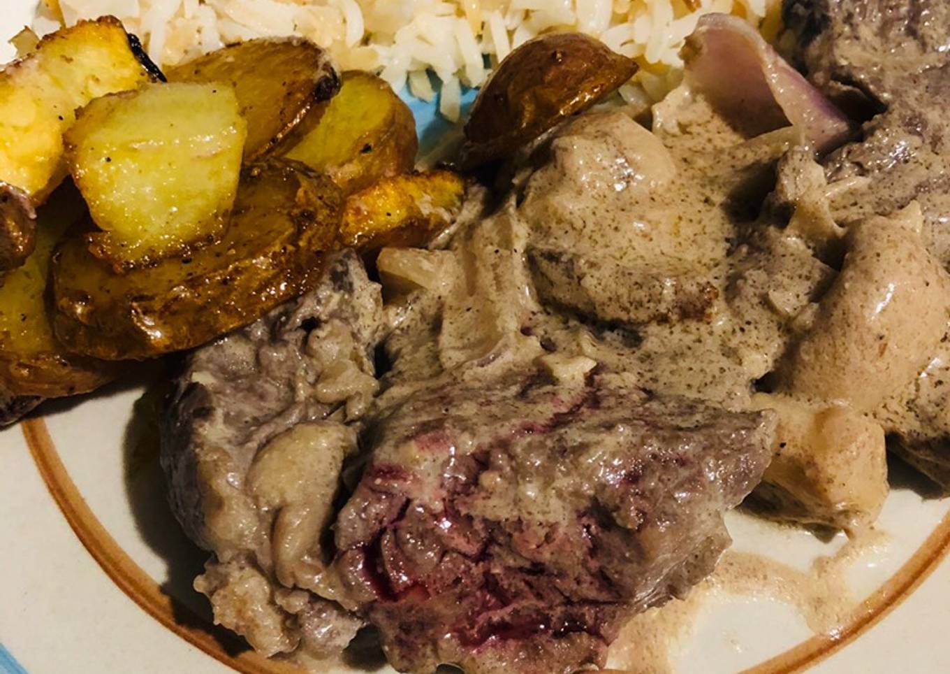 - En el sartén donde se utilizó anteriormente se coloca la carne y se adiciona sal y pimienta a gusto, una vez está la carne se agrega la leche, crema y el vino hasta que rebaje unos minutos el vino y se adicionan los champiñones que teníamos en el recipiente.